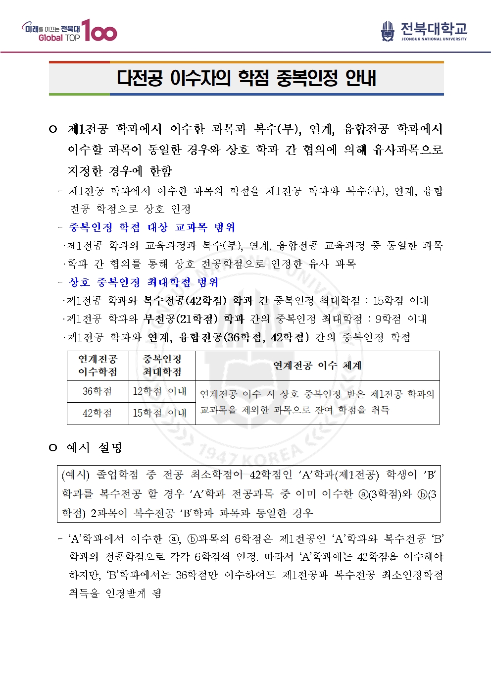 다전공(부전공, 복수․연계․융합전공) 이수자 학점 중복인정 신청 안내